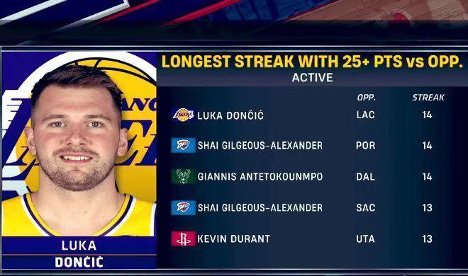 伴隨東契奇因傷退賽,他面對快船連續(xù)15場得分25+的紀(jì)錄定格在14場,無緣超越亞歷山大與字母哥分別面對開拓者與獨(dú)行俠連續(xù)14場得到25+,未能繼續(xù)刷新球員面對同一球隊(duì)連續(xù)得分25+現(xiàn)役第一紀(jì)錄。